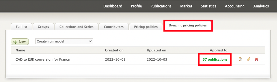 You can view your different dynamic pricing policies at any time by clicking on the Dynamic pricing policies tab from the Publications screen.
