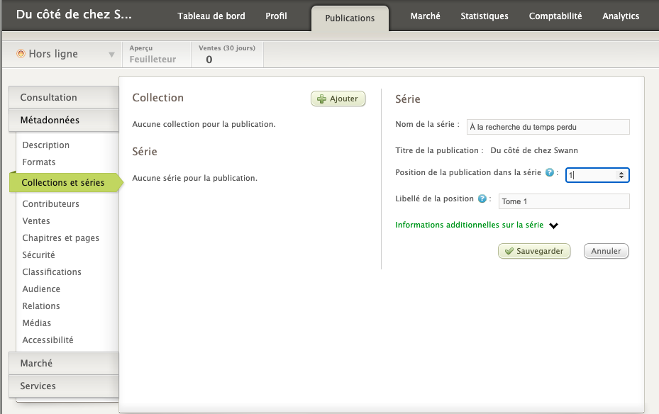 Si vous voulez être absolument certain que votre série soit clairement visible sur tous les sites de vente, vous pouvez également ajouter l'information de la série dans le sous-titre. Dans l'exemple cité plus haut, le titre pourrait être Du côté de chez Swann et le sous-titre À la recherche du temps perdu - tome 1.