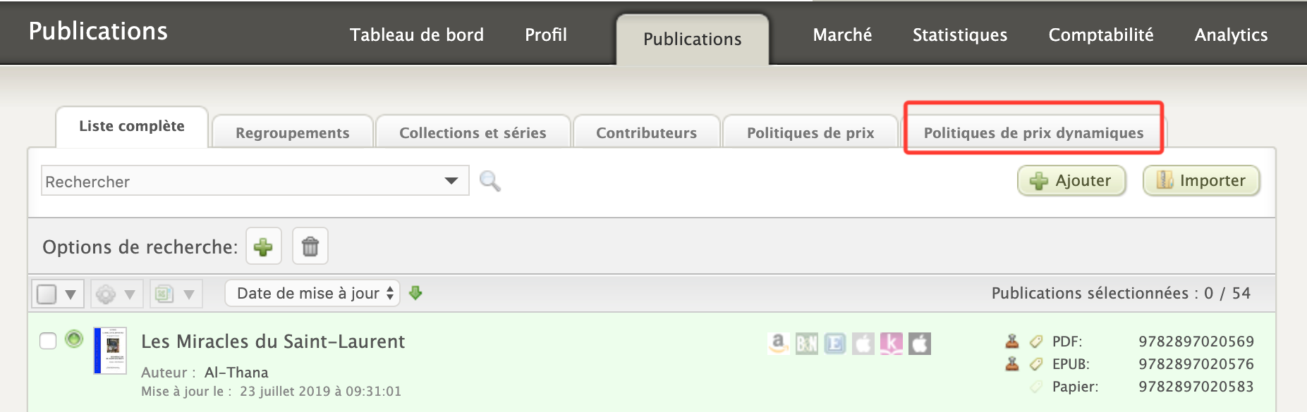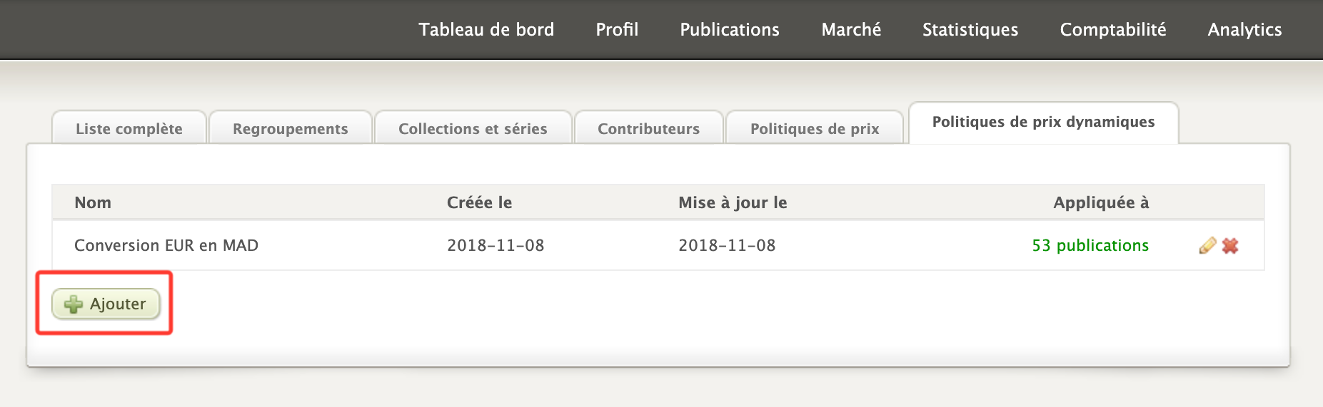 Dans l'écran Publications, cliquez sur l'onglet Politiques de prix dynamiques puis sur Ajouter.