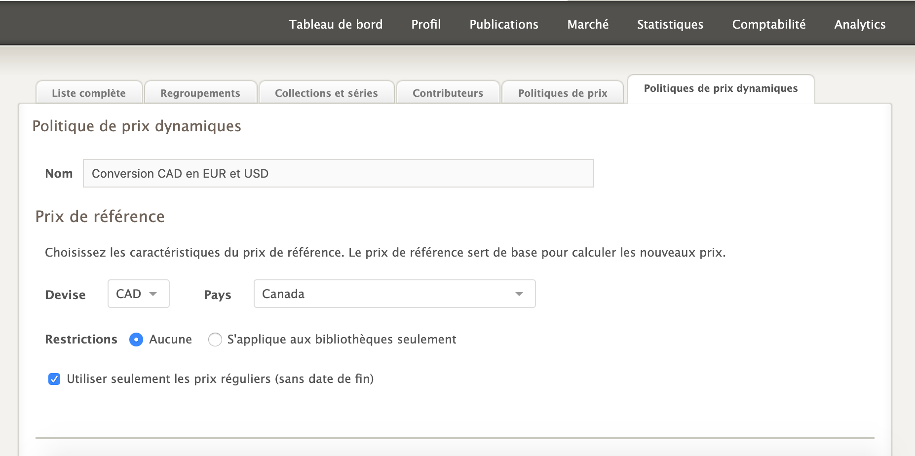 Dans votre politique de prix dynamiques, il sera donc nécessaire de spécifier les critères auxquels répond votre prix de référence pour permettre à la plateforme de trouver le prix correspondant dans chaque publication concernée.