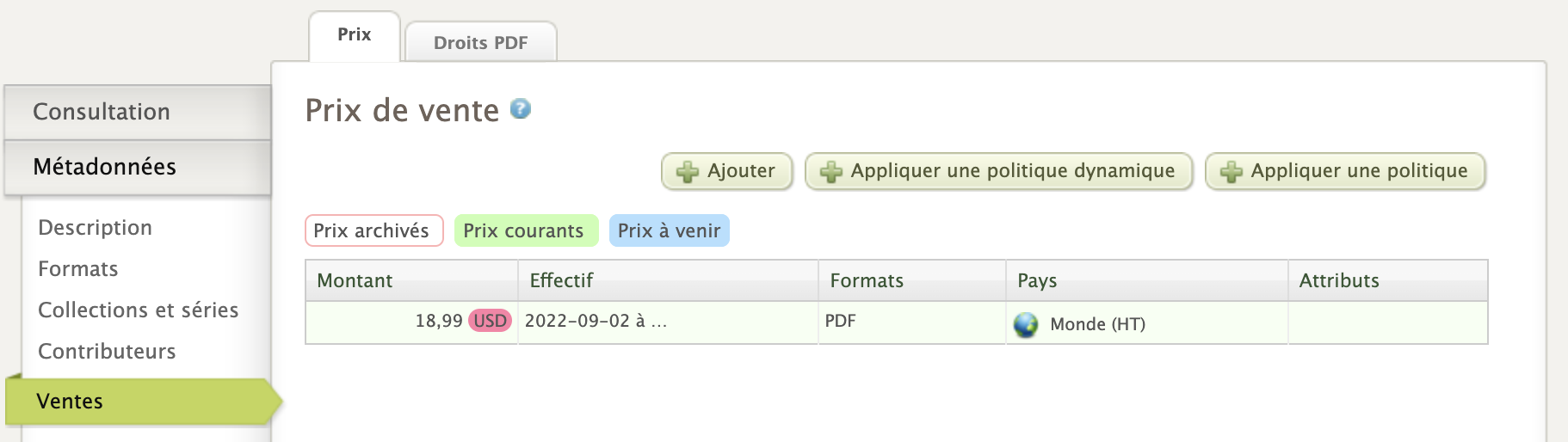 Dans la section Métadonnées > Ventes le prix Monde s’affiche comme un seul prix portant l’intitulé Monde.